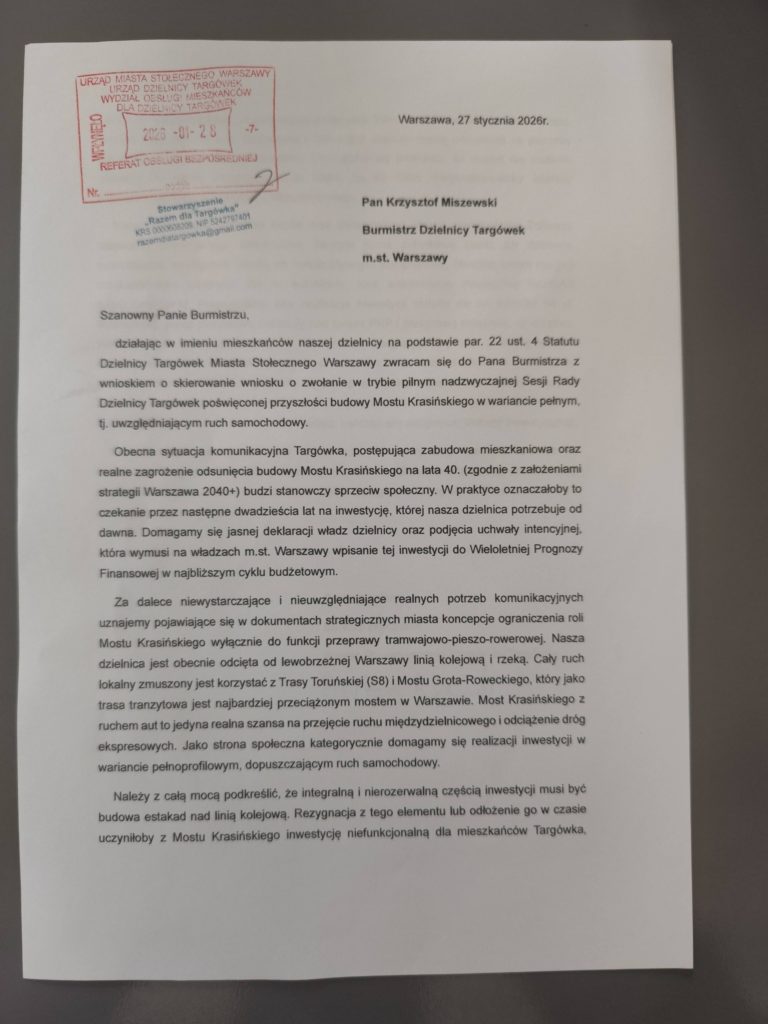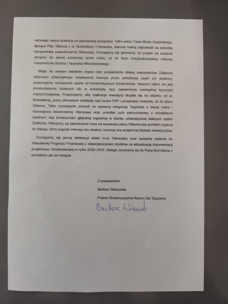 Należy z całą mocą podkreślić, że integralną i nierozerwalną częścią inwestycji musi być budowa estakad nad linią kolejową. Rezygnacja z tego elementu lub odłożenie go w czasie uczyniłoby z Mostu Krasińskiego inwestycję niefunkcjonalną dla mieszkańców Targówka, odcinając naszą dzielnicę od planowanej przeprawy. Tylko pełna Trasa Mostu Krasińskiego, łącząca Plac Wilsona z ul. Matki Teresy z Kalkuty i Odrowąża stanowi realną odpowiedź na potrzeby transportowe prawobrzeżnej Warszawy. Domagamy się gwarancji, że projekt nie zostanie okrojony do samej przeprawy przez rzekę, co de facto marginalizowałoby interesy mieszkańców Bródna i Targówka Mieszkaniowego.